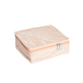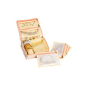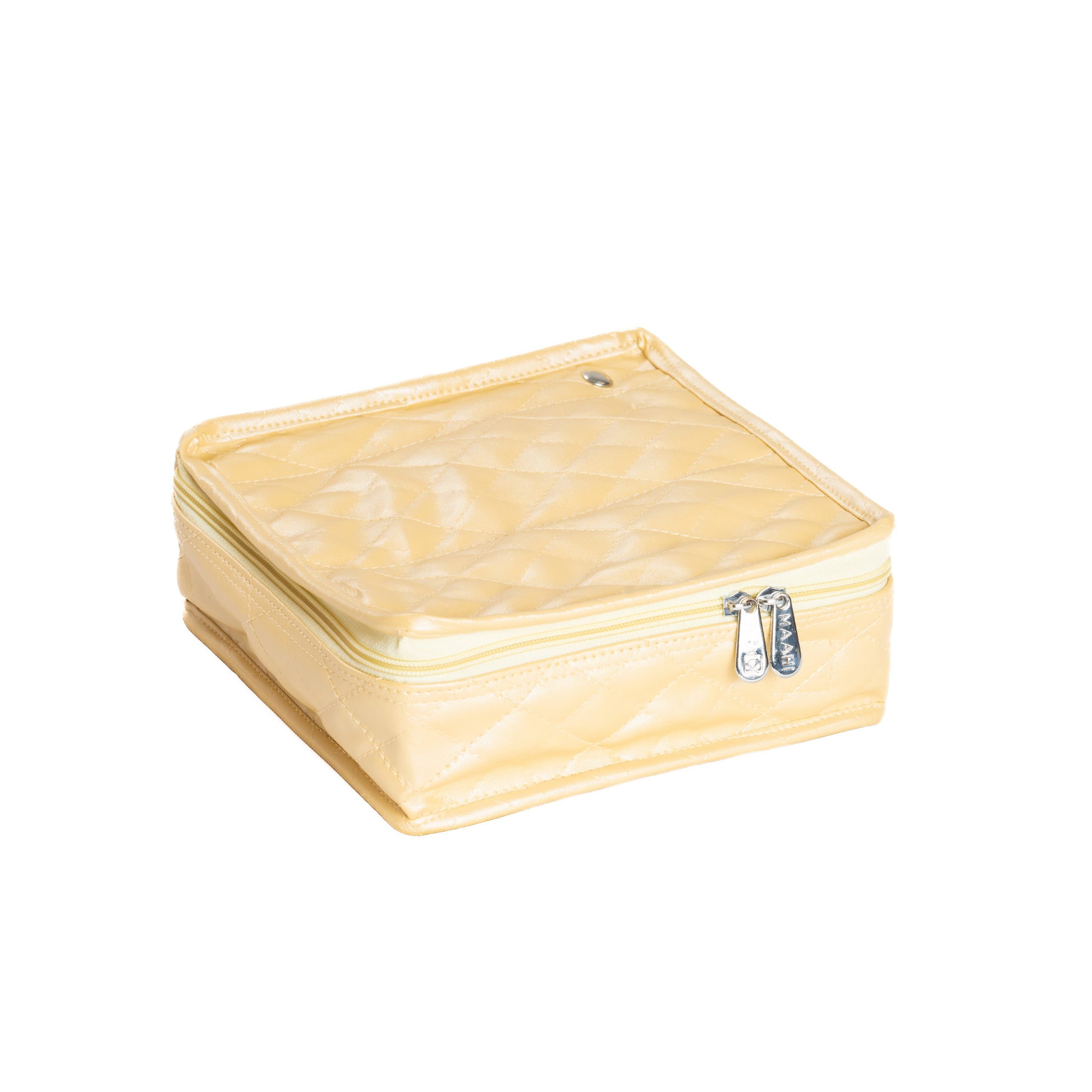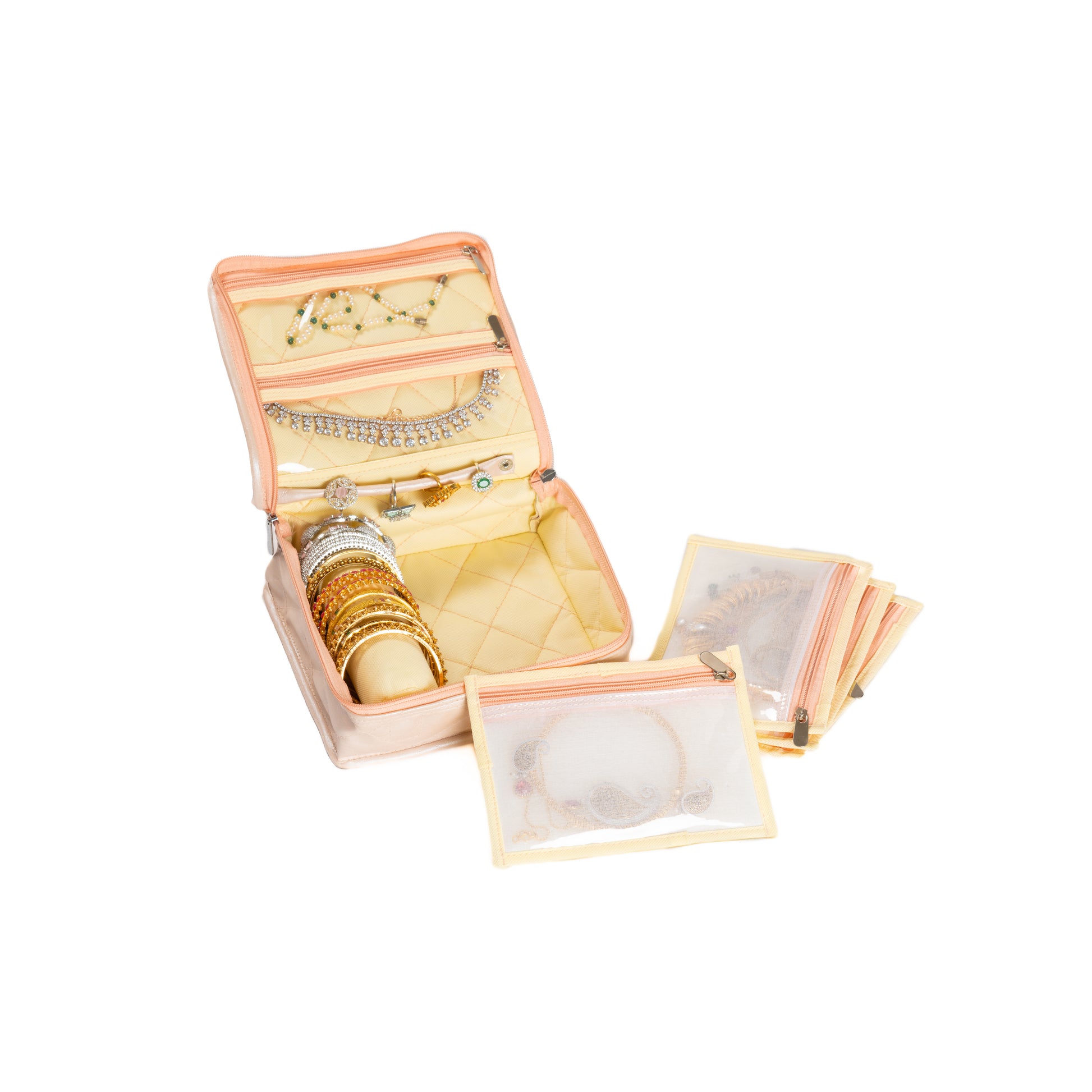 the perfect travel companion to carry all your travel essentials in a stylish and organised fashion. Comes with 4 small jewellery pouches with inner lining of malaml fabric, a bangle roll, 2 pockets on the lid for your go to jewellery and ra ring stand.